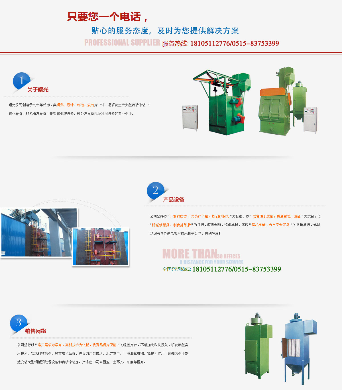 現(xiàn)建有三個(gè)生產(chǎn)廠區(qū),擁有各類優(yōu)良的加工設(shè)備300多套,員工100多名,其中專業(yè)技術(shù)人員20多名。先后為江蘇悅達(dá)、北方重工、上海煙草機(jī)械、福建力佳等幾十家知名企業(yè),制造安裝大型鋼板預(yù)處理設(shè)備和噴砂涂裝房。產(chǎn)品暢銷江蘇、浙江、安徽、山東、湖南、湖北、河南、河北、四川、福建、山西、內(nèi)蒙古、北京、上海等全國二十多個(gè)省市,出口俄羅斯、馬來西亞...